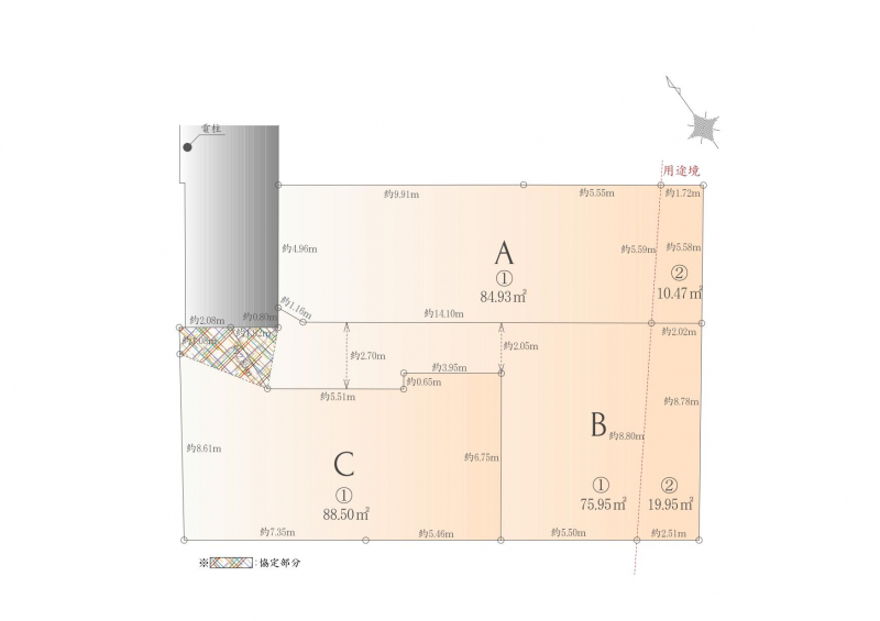 | 敷地面積 | A区画:約95.40㎡ B区画:約95.90㎡ C区画:約88.50㎡ |